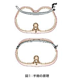 漏斗胸に対する矯正手術においては、金属バーを胸郭に装着して胸郭の形を整えます(図1)。この手術方法(ナス法)については多くのサイトにて紹介されています。